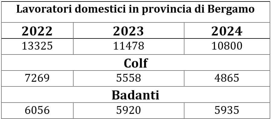 In Italia, quasi due milioni di famiglie usufruiscono dei servizi di colf o badanti. Come già evidenziato altre volte, però, solo la metà di queste gestiscono rapporti regolari e contrattualizzati, mentre altrettante ricorrono al lavoro irregolare, alimentando il sommerso che continua a caratterizzare pesantemente il lavoro domestico. A Bergamo il panorama non cambia, anzi, se possibile, peggiora. Gli ultimi numeri bergamaschi parlano di una popolazione “bisognosa” di circa 60.000 persone, delle quali poco più di un decimo (6.400) ha trovato posto nelle RSA della provincia. Ne consegue che il numero di meno di 5.935 badanti registrati all’INPS è assolutamente insufficiente e sicuramente espressione lampante del tanto sommerso che anima questo specifico settore. A Bergamo, nel corso dell’ultimo anno, si è spesa una cifra “ufficiale” di circa 150 milioni di euro per gli stipendi dei collaboratori domestici. Considerando che i lavoratori “regolari” si misurano, indicativamente, solo per il 48% dell’intera forza di lavoro occupata nel settore, è facile pensare che se ne sia speso almeno altrettanto per pagare le tante lavoratrici che non hanno (o non vogliono) un contratto. A questo proposito, va anche sottolineato come complessivamente fra colf e badanti l’occupazione a Bergamo era di 13.931 persone nel 2021, di 13.303 nel 2022 e di 11.392 nel 2023, con una continua discesa dei contratti regolari.